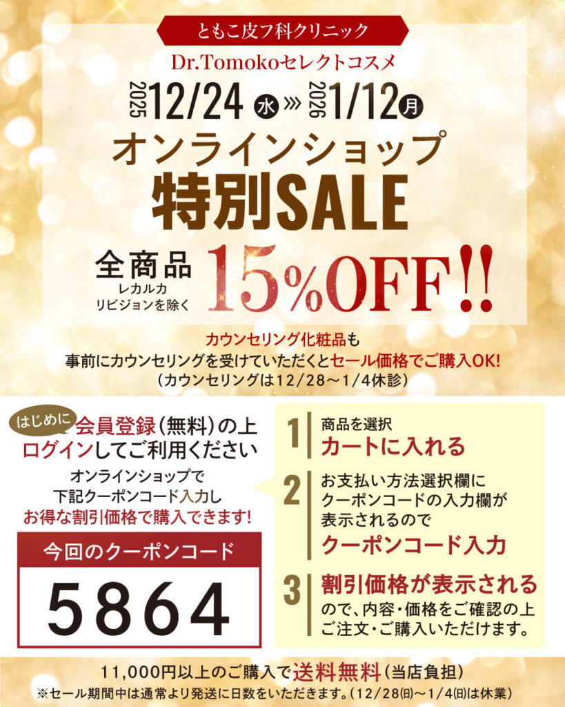 Dr.ともこセレクトコスメオンラインショップで人気のドクターズコスメやサプリメントをお得にご購入いただける、年末年始特別SALEを開催!
